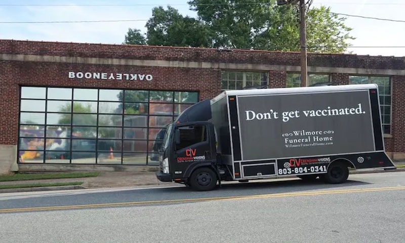 ویکسین مت لگوائیں !میت گاڑی کا اشتہار