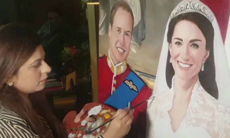 غیرملکی مہمانوں کی پیٹنگز بنانے میں مہارت رکھنے والی مصورہ رابعہ ذاکر نے شاہی جوڑے کا پورٹریٹ بھی تیار کیا۔