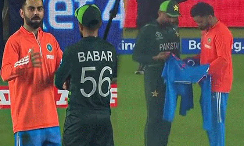 پاک بھارت میچ کے بعد بابر اعظم اور ویرات کوہلی کی گراؤنڈ میں ملاقات ہوئی۔