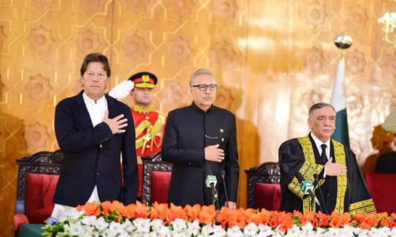 صدر پاکستان عارف علوی نے جسٹس آصف سعید کھوسہ سے حلف لیا۔ وزیراعظم عمران خان بھی تقریب حلف برداری میں شریک ہوئے