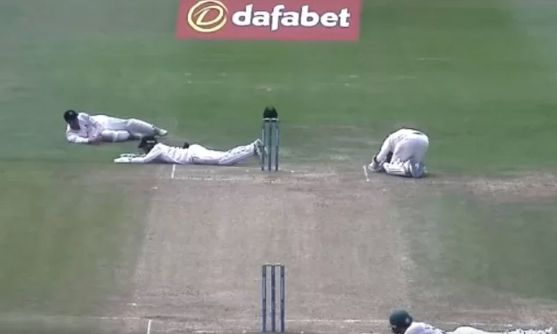 مکھیاں سے بچنے کے لیے کھلاڑی اور ایمپائیر زمین پر لیٹ گئے